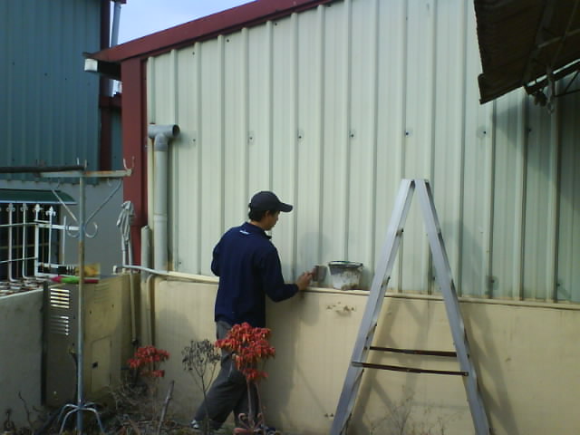 外墻│墻壁防水工程 ~~有全面性防水的心態(tài)才不會造成抓這裡漏那里的情況. 將可能造成漏水的必須施工處整理清潔, 此工程是采用外墻瓷磚面專用的透明防水材, 施作全面性包覆, 鐵皮屋烤漆浪板搭接處,還有釘頭補上填縫材(速利康).